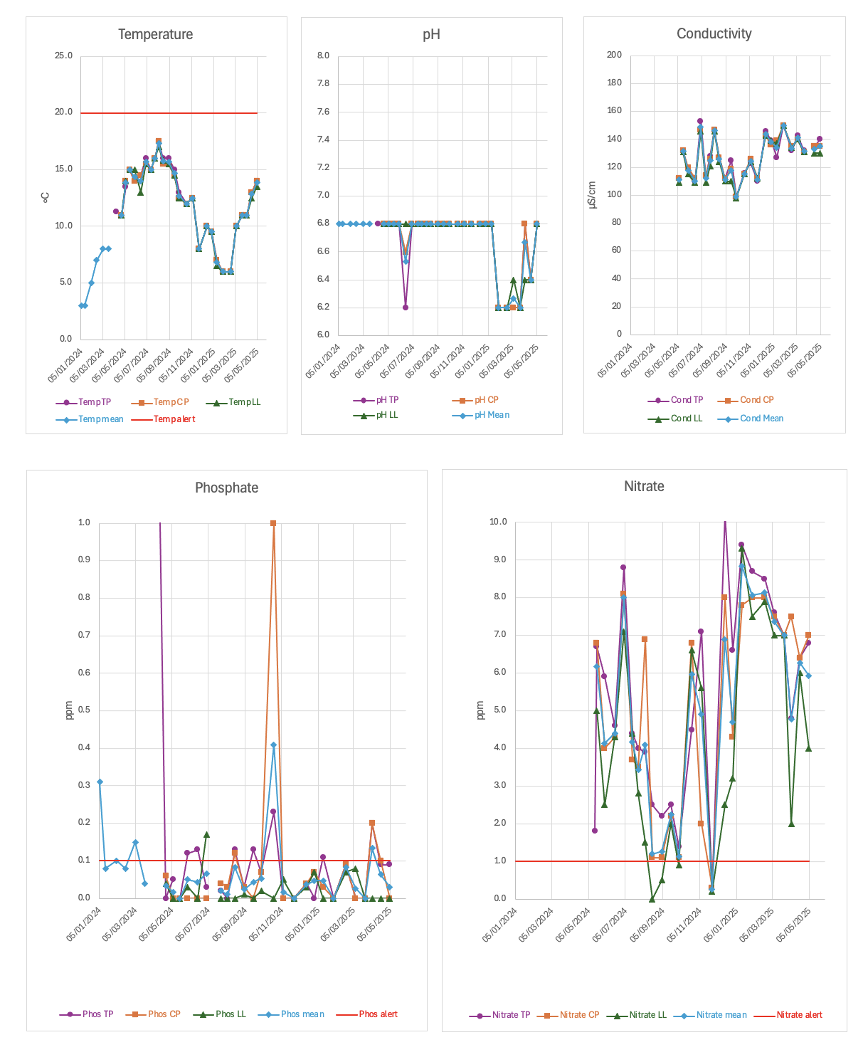 every 2 weeks at three test locations; TP = Town Pools; CP = Corner Pool on the Llanerchaeron